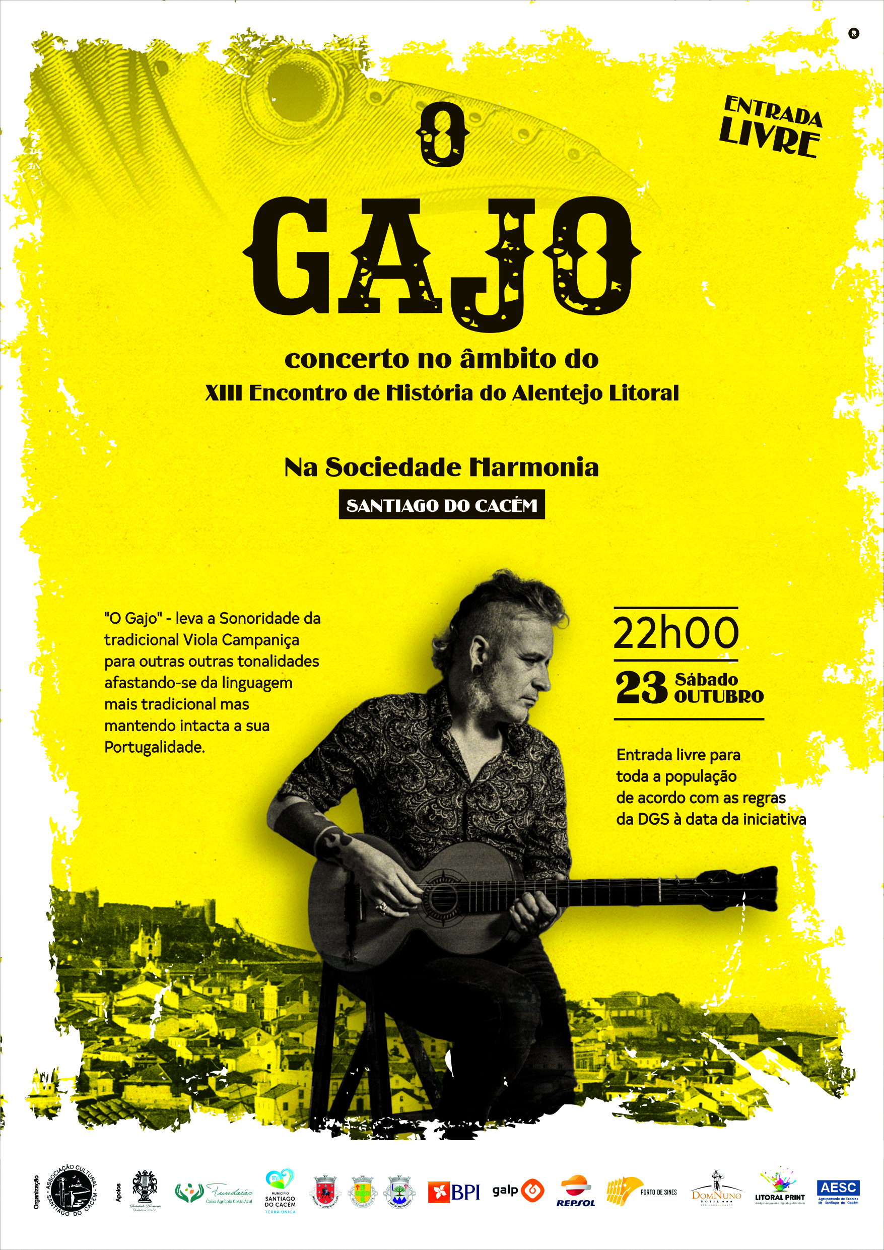 A partir das 22h esta Associação convida-os ainda, a assistir a um espectáculo musical com " O Gajo" (viola Campaniça), com entrada também livre, ficando unicamente sujeita à capacidade da sala e às directrizes impostas pela DGS à data do espectáculo.